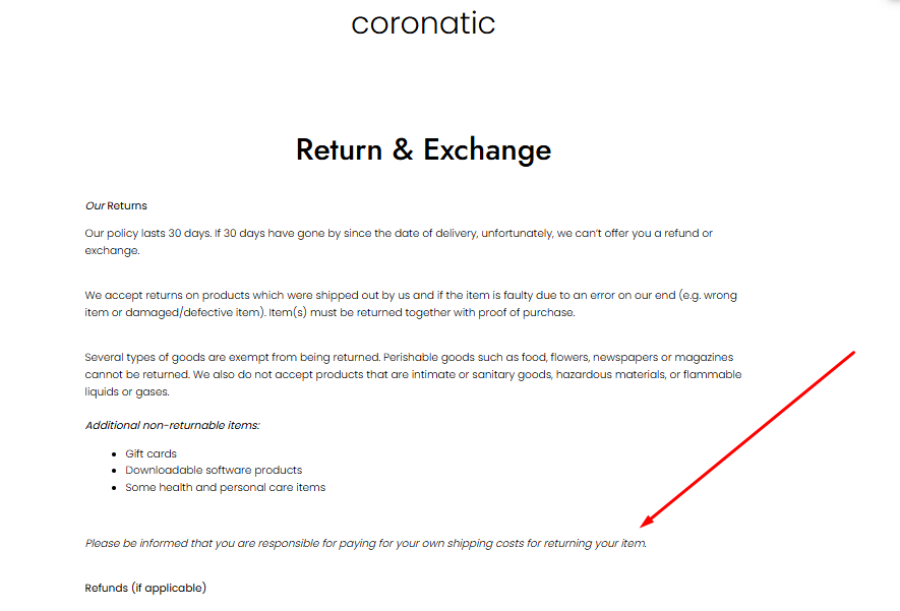 Coronatic.com clearly states that customers are responsible for paying their own return shipping costs.