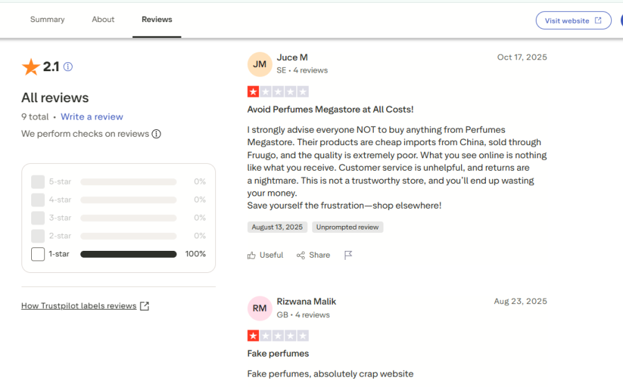If you look at Trustpilot, the feedback for Perfumesmegastore.com is far from glowing. With a dismal 2.1-star rating, the community has voiced significant frustration regarding what arrives in the mail. Many customers have explicitly warned others to stay away from the site entirely.