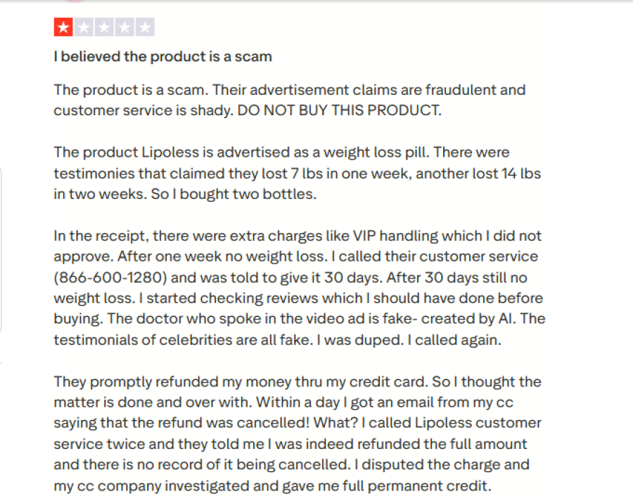 “Do NOT buy from Lipoless… I have been trying to contact this company several times for a refund, and no response… Have not lost an ounce and want the refund they promised.”