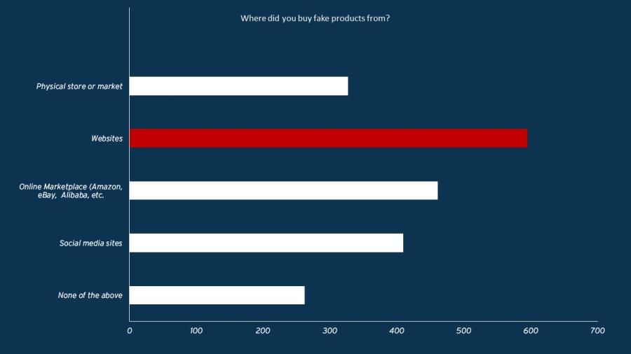 Social media sites are named by 28% of consumers and 22% bought fakes from physical stores. Physical markets and stores are slowly losing popularity while buying directly via Social Media is on the rise (but not yet as big as websites).