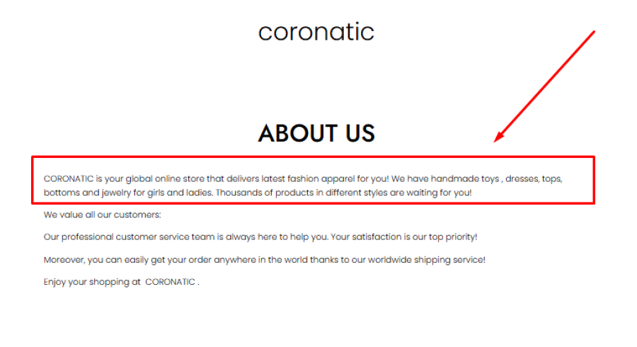 At face value, Coronatic.com presents itself as a global online fashion store offering everything from dresses and tops to jewelry and even handmade toys. It sounds broad, but still believable.