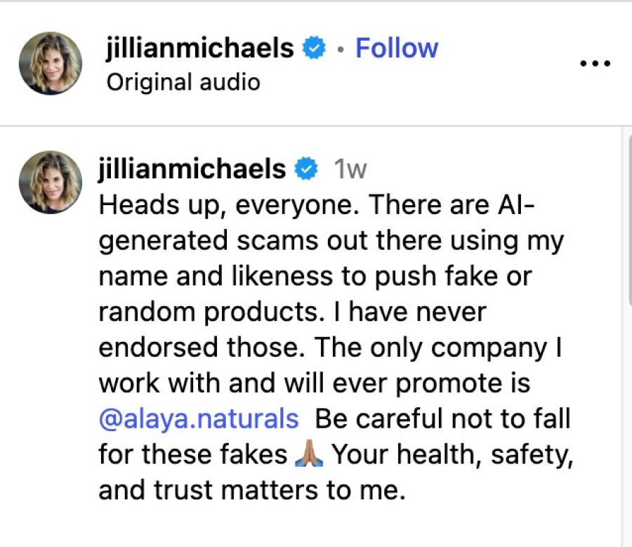One of the most concerning points is that these promotions misuse Jillian Michaels’ likeness and name. The videos often appear to show Jillian discussing the “secret gelatin trick” on TV or social media. However, the footage has been manipulated with AI-generated voiceovers and edited scripts to give the impression that she endorses the product. Jillian Michaels herself addressed this on Instagram: