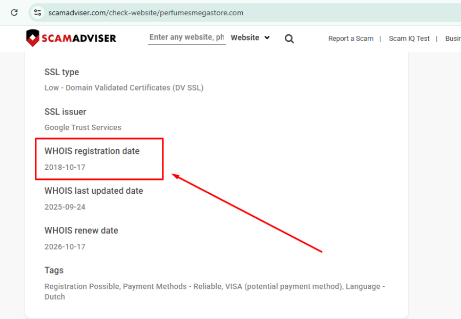 The WHOIS registration date for Perfumesmegastore.com is 2018-10-17, making it over five years old. In the world of online shopping, a site that lasts more than a year is usually considered more stable than a "fly-by-night" operation. However, longevity is not a shield against poor business practices.