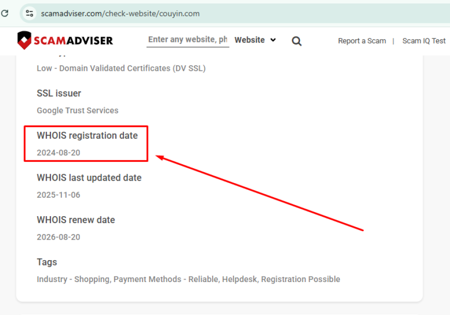 Betrüger lügen oft über ihre Erfahrung, um Ihnen das Gefühl zu geben, dass Sie es mit einer etablierten Marke zu tun haben. Couyin.com behauptet auf seiner Website, dass es im Jahr 2023 gegründet wurde, doch die technischen Registrierungsdaten sprechen eine andere Sprache. Die Domain wurde tatsächlich am 20. August 2024 registriert und ist damit ein brandneuer Akteur auf dem Markt.