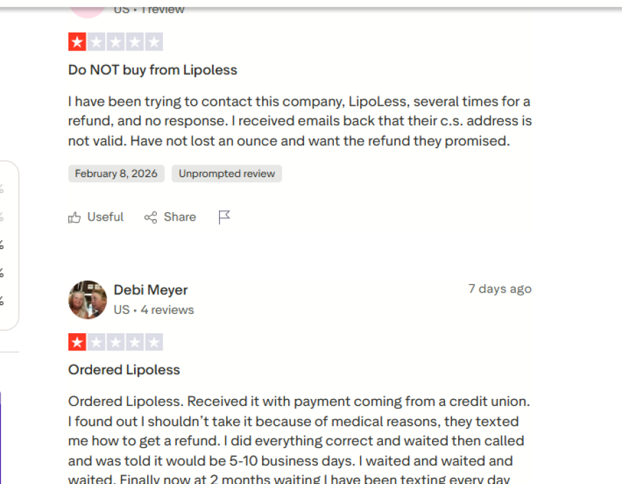 “Do NOT buy from Lipoless… I have been trying to contact this company several times for a refund, and no response… Have not lost an ounce and want the refund they promised.”