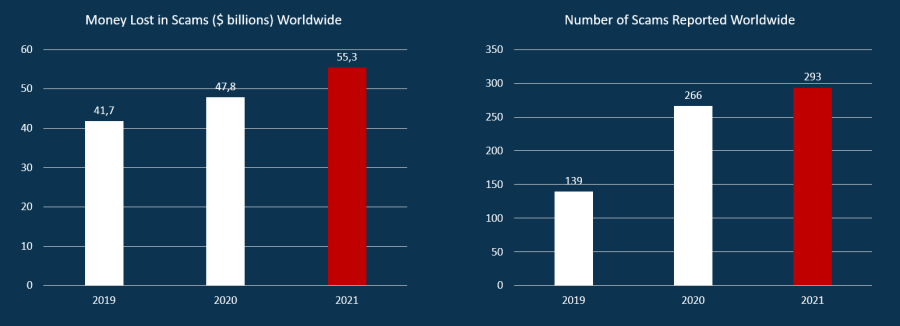 An estimated 293 million scam reports were filed and $55.3 billion was lost in scams in 2021 worldwide