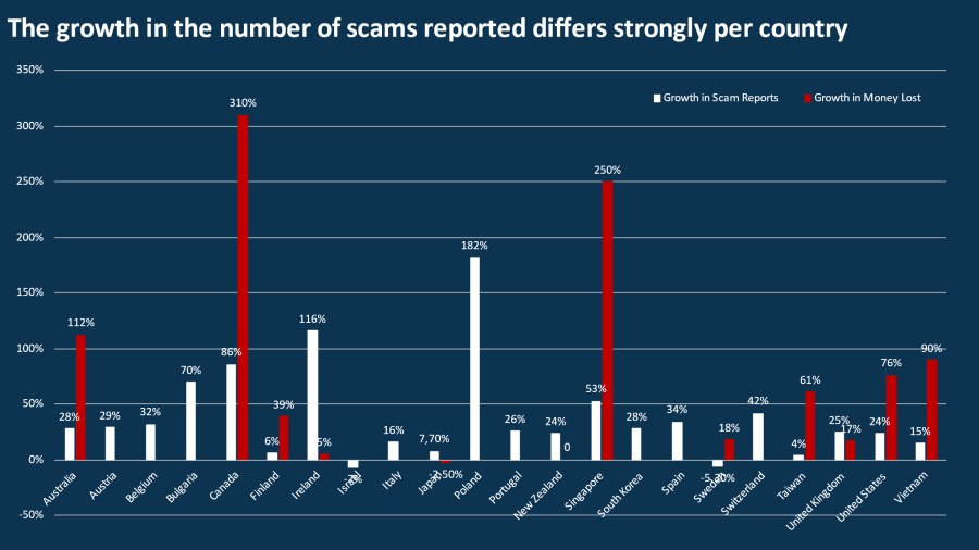 2021 introduced a blurring of investment with romance scams. Where victims of romance scams used to lose money to pay for hospital, travel or other urgent needs of their virtual lovers, these scammers are increasingly switching to making “joint” investments together. To make matters worse, scam victims are after the scam approached by “money recovery” firms. These often are the same scam group, promising to help the victim retrieve his loses, of course, after first paying an “administration” fee. The money is never actually recovered. As a result, in most countries researched, the number of scam reports has not only increased, but they report an ever-stronger growth in money lost.