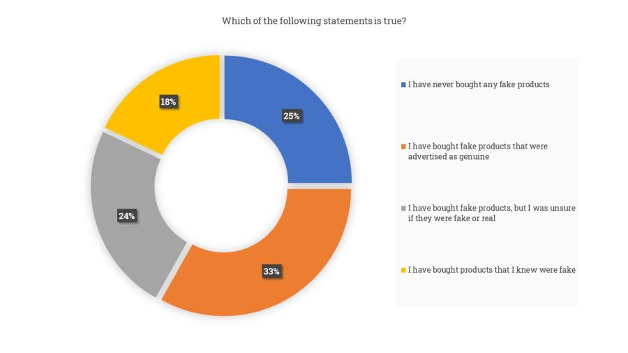 Still, 57% of the consumers have bought a fake product in the past unknowingly or doubting the originality of the product. 18% admit to knowingly having bought fakes. Clothing, electronics and accessories are the most commonly purchased fake products.